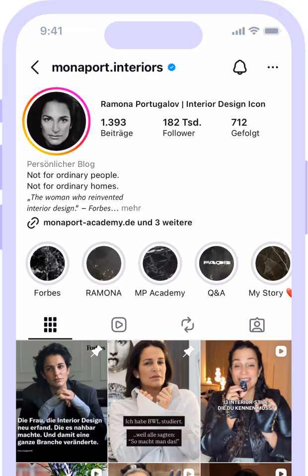 Ich habe selbst jahrelang nach Antworten gesucht, Fehler gemacht und Zeit verloren. Nach meinem BWL-Studium habe ich Interior Design in New York studiert – doch ein klassisches Studium ist oft zu theoretisch und dauert ewig. Das echte Business musste ich mir mühsam selbst beibringen. Heute gehöre ich zur Spitze der Branche, erreiche 8 Millionen Menschen monatlich auf Social Media und leite ein Team in Berlin am Ku’damm – als dreifache Mama.